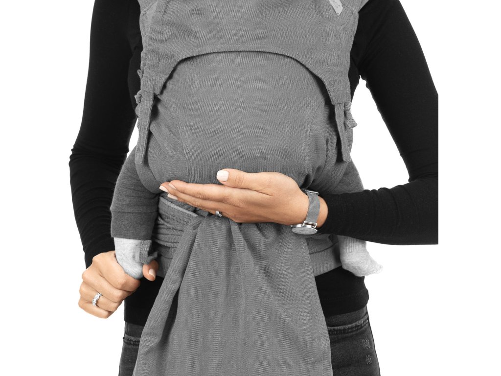 Měkký bederní pás tohoto nosítka se zapíná pomocí bezpečnostní přezky, která se velmi snadno dotahuje a je vhodné od konfekční velikost XS po XXL. Jeho ramenní popruhy jsou široké přibližně jako polovina šířky samotného šátku a do poloviny šíře měkce polstrované. Křížením popruhů přes zadeček dítěte můžete ještě zvýšit nosnost a pohodlnost při nošení těžších dětí. Velké oblibě se těší i u tatínků, kteří oceňují snadné nasazení nosítka.