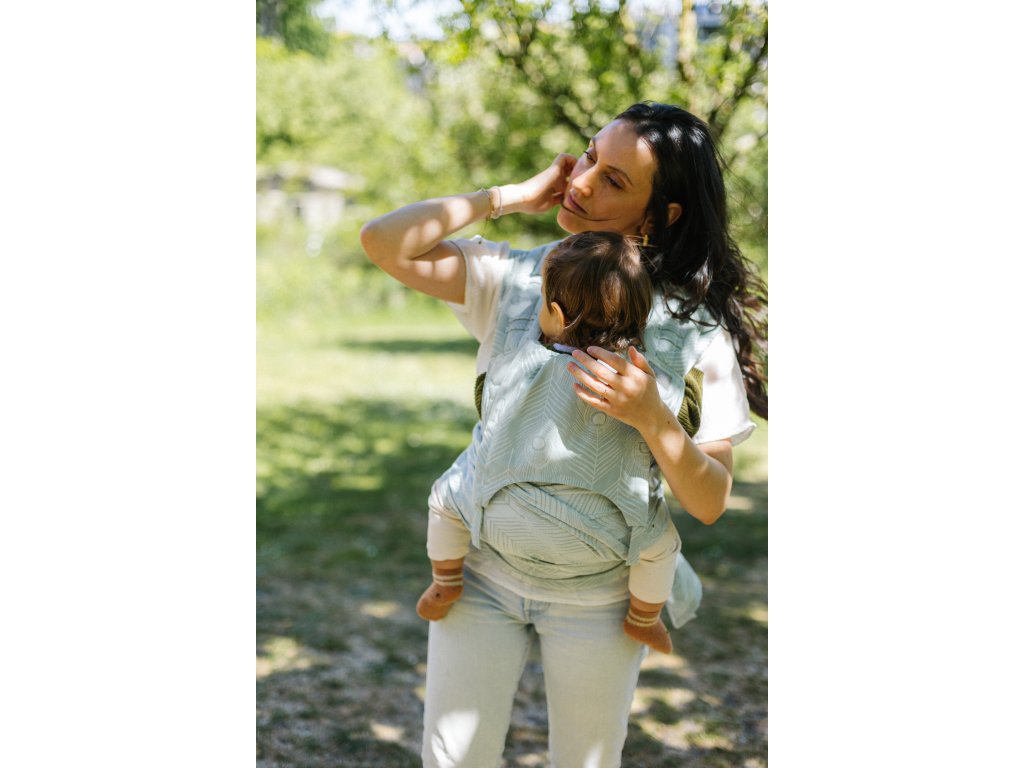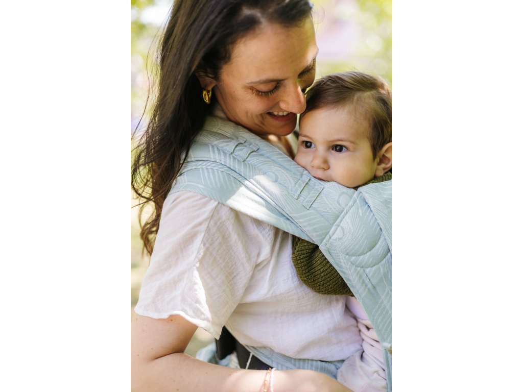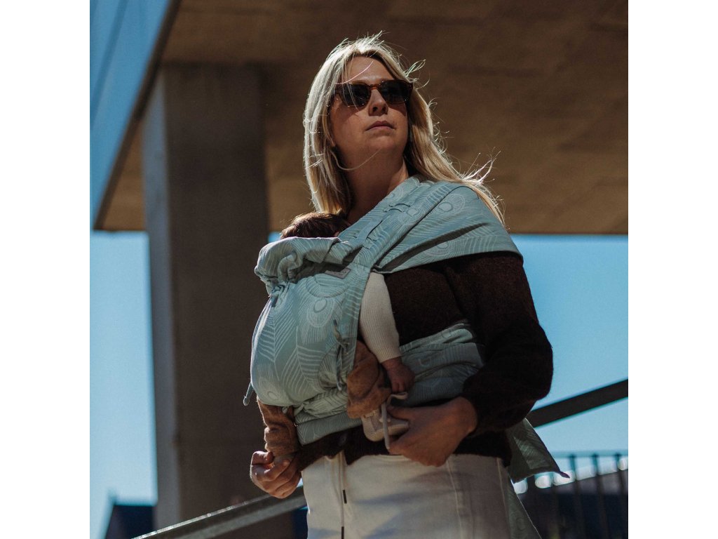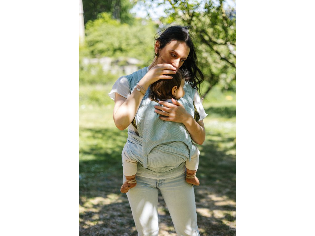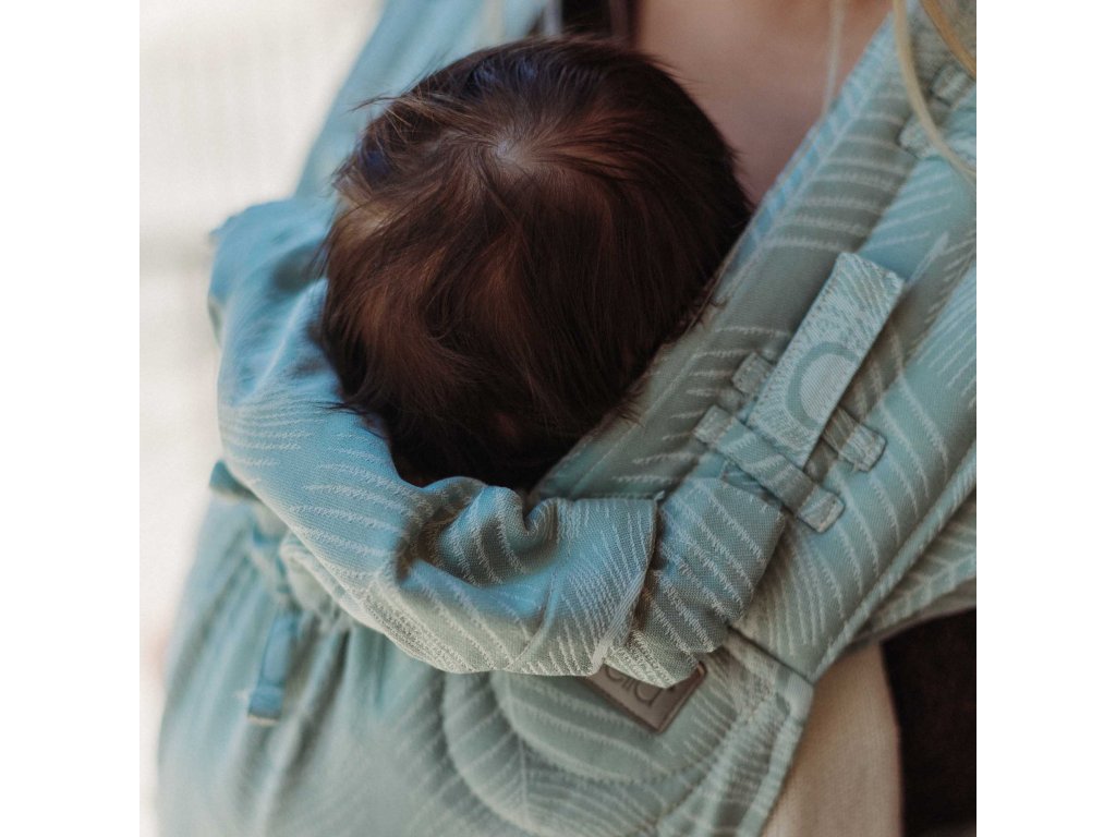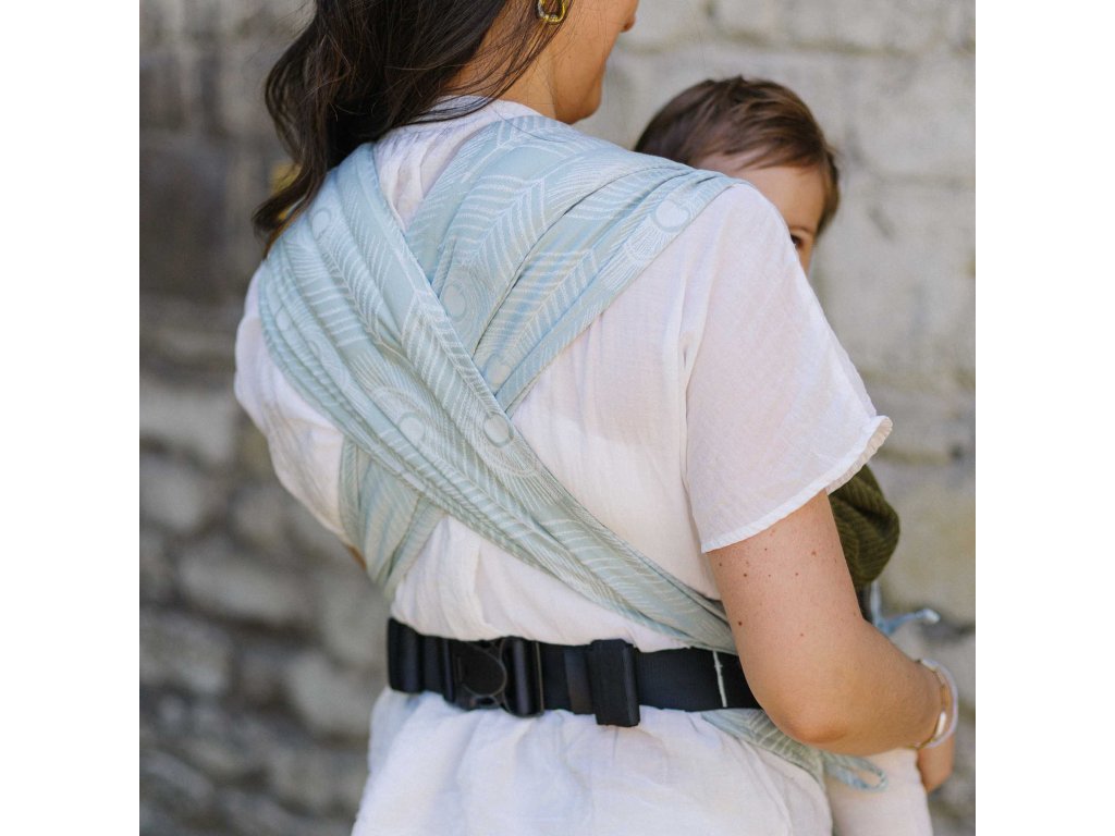 Měkký bederní pás tohoto nosítka se zapíná pomocí bezpečnostní přezky, která se velmi snadno dotahuje a je vhodné od konfekční velikost XS po XXL. Jeho ramenní popruhy jsou široké přibližně jako polovina šířky samotného šátku a do poloviny šíře měkce polstrované. Křížením popruhů přes zadeček dítěte můžete ještě zvýšit nosnost a pohodlnost při nošení těžších dětí. Velké oblibě se těší i u tatínků, kteří oceňují snadné nasazení nosítka.