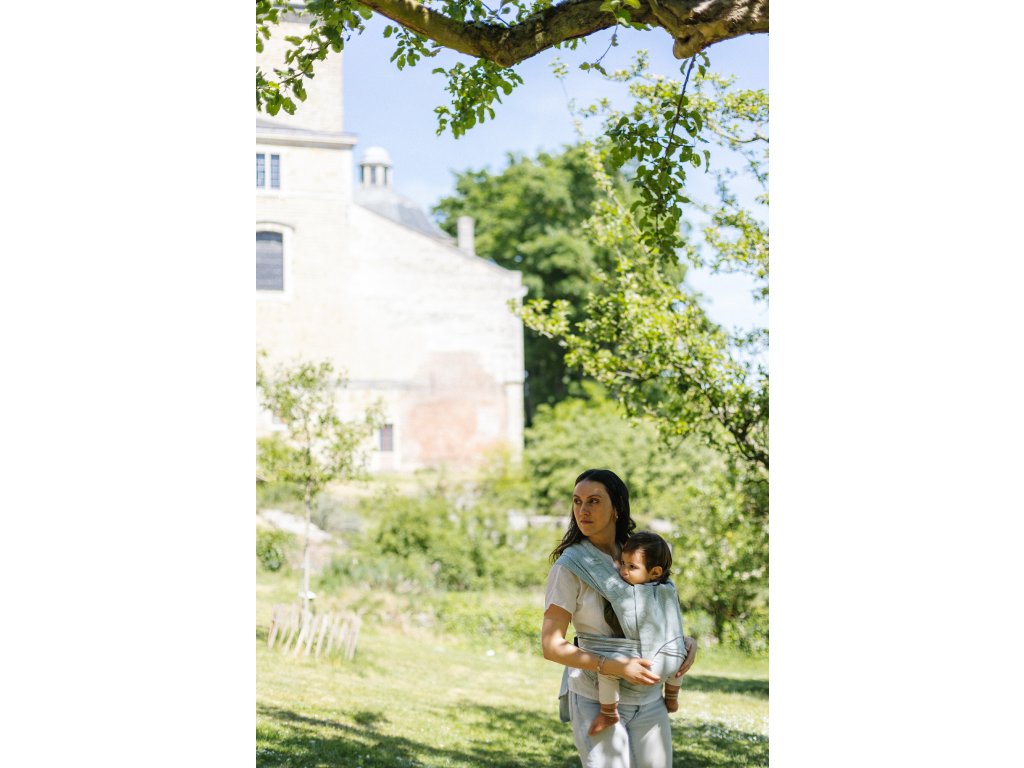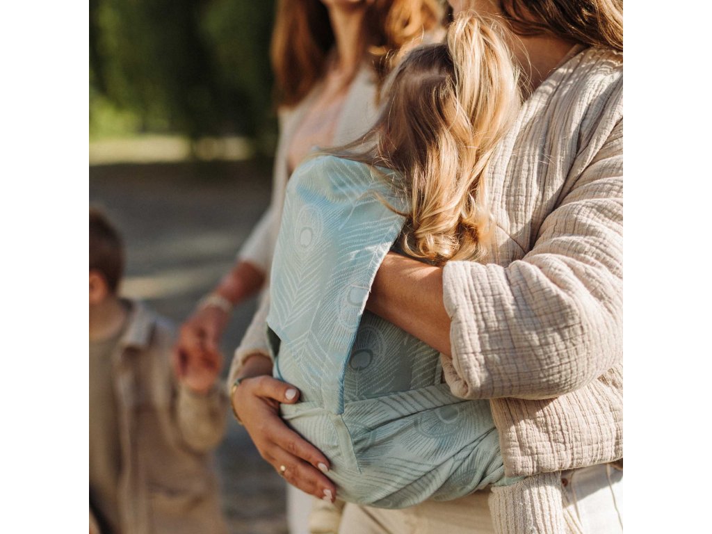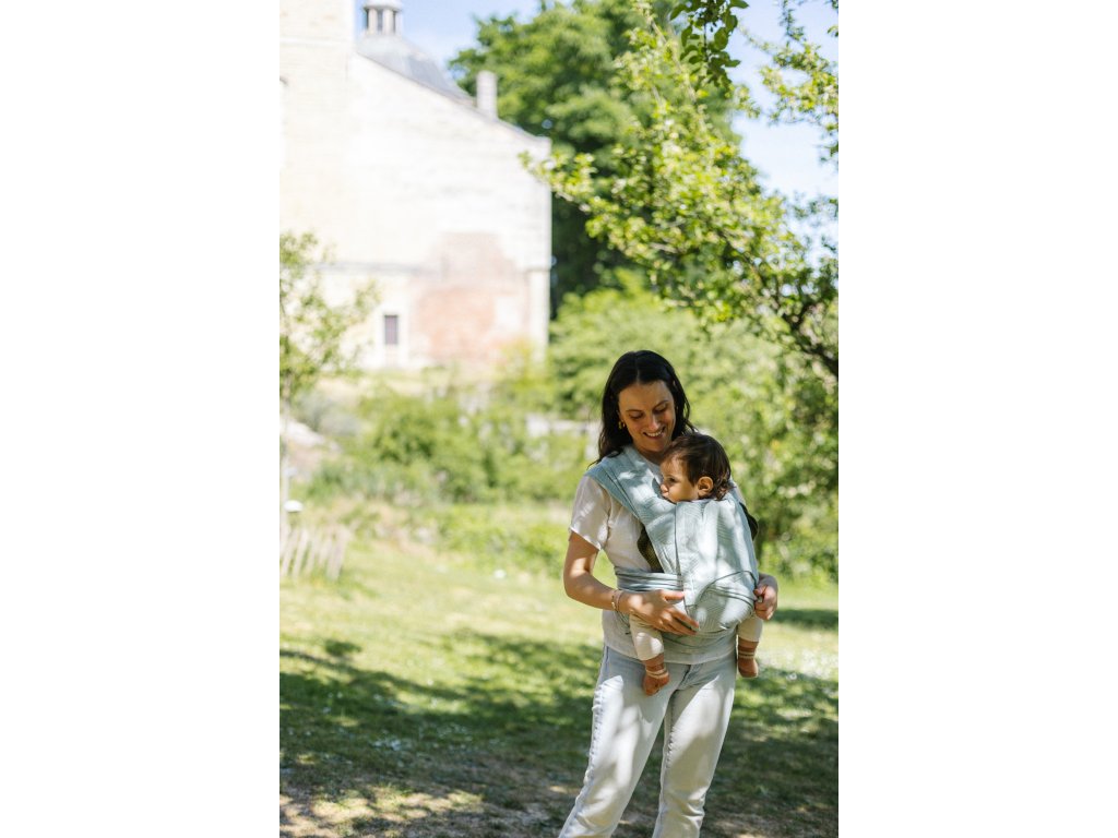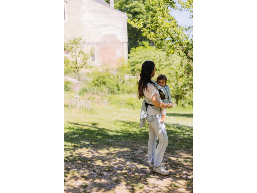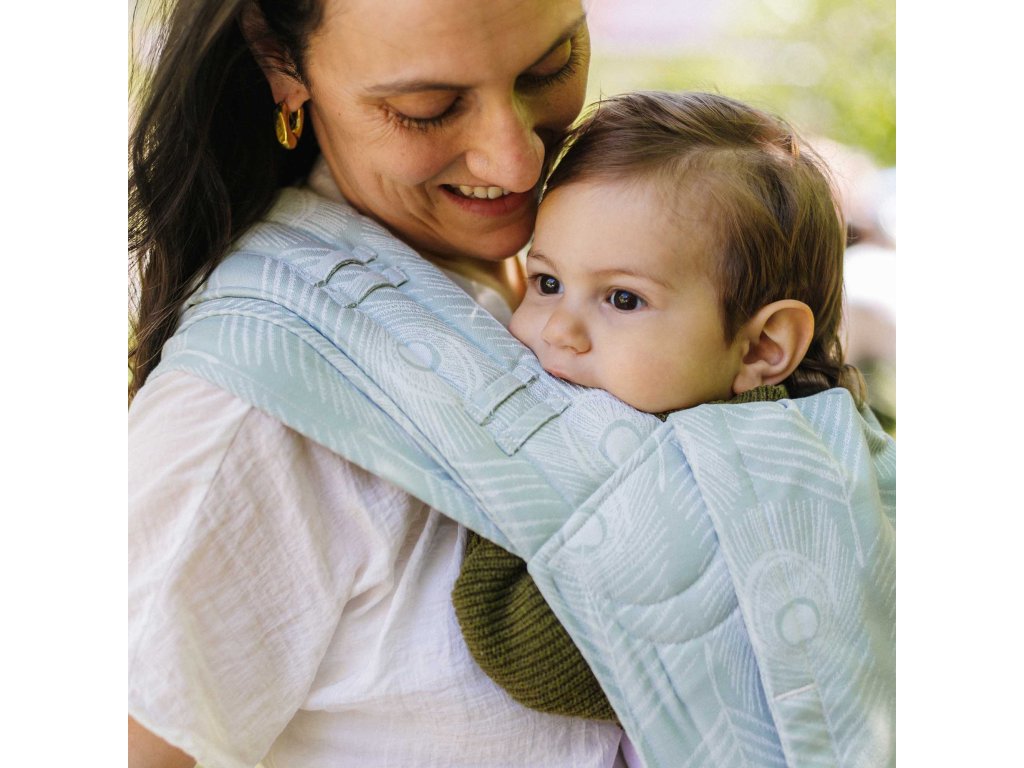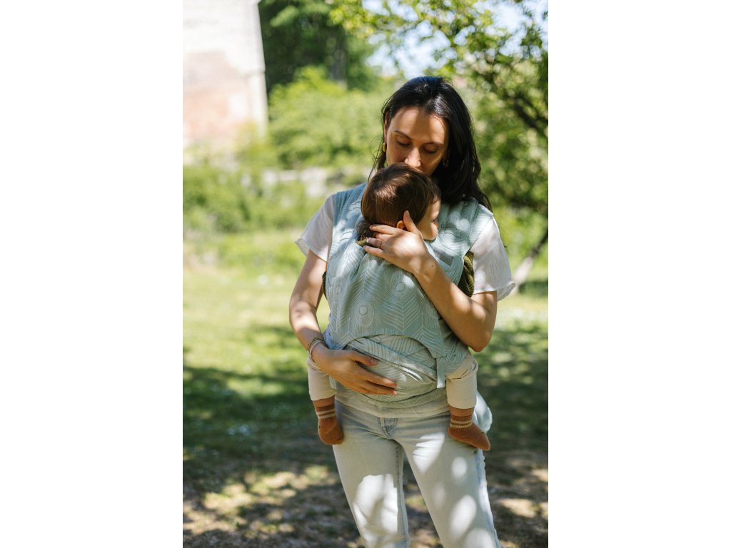 Měkký bederní pás tohoto nosítka se zapíná pomocí bezpečnostní přezky, která se velmi snadno dotahuje a je vhodné od konfekční velikost XS po XXL. Jeho ramenní popruhy jsou široké přibližně jako polovina šířky samotného šátku a do poloviny šíře měkce polstrované. Křížením popruhů přes zadeček dítěte můžete ještě zvýšit nosnost a pohodlnost při nošení těžších dětí. Velké oblibě se těší i u tatínků, kteří oceňují snadné nasazení nosítka.