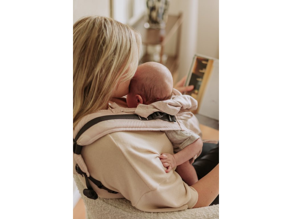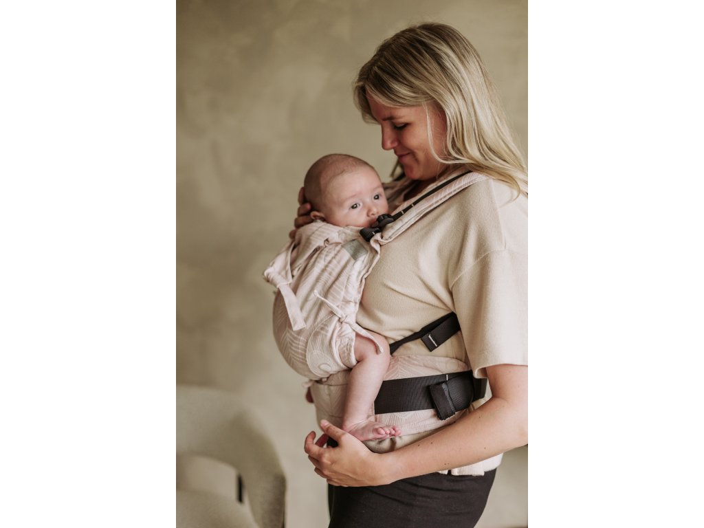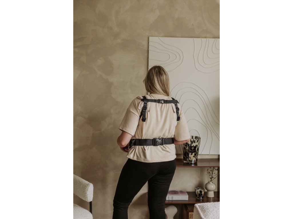 Toto ergonomické nosítko má měkký bederní pás s plastovou přezkou se zapínáním na boku a pro zvýšení bezpečnosti je zde opatřený i jistící gumičkou, skrze kterou se přezka provleče. Ramenní popruhy nosítka Fusion Baby jsou měkce polstrované a mají dvě možnosti zapínání: