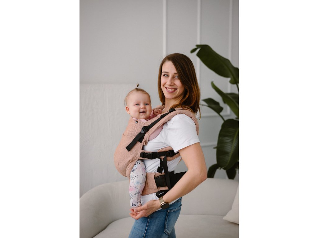 Možnost dvojího zapínání: Pro nejmenší miminka zapínání na bederním pásu (pro optimální zakulacení zádíček miminka), pro starší miminka pak zapínání do boků zádové opěrky.
