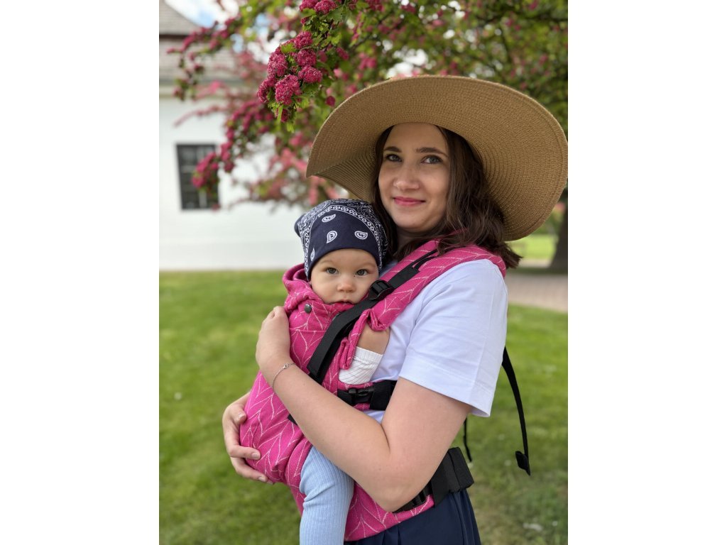 Možnost dvojího zapínání: Pro nejmenší miminka zapínání na bederním pásu (pro optimální zakulacení zádíček miminka), pro starší miminka pak zapínání do boků zádové opěrky.