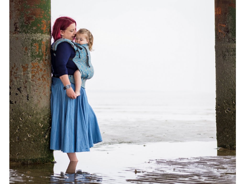 Toto rostoucí ergonomické nosítko má tvarovaný a tvrdý bederní pás. Jeho ramenní popruhy jsou velmi příjemně polstrované bez možnosti křížení. Šířka zádového panelu se nastavuje pomocí systému patentů tak, aby sahala do podkolenních jamek pro dosažení M-pozice (kolena jsou výše než kyčelní klouby, zadeček nejníže). Výšku nosítka upravíte stažením pásků po stranách zádového panelu.